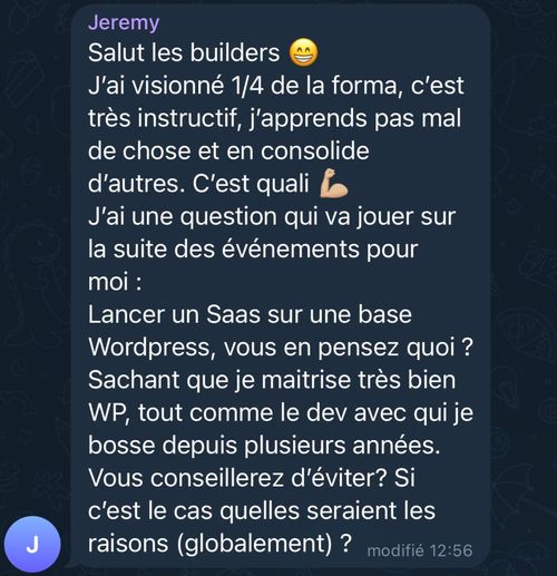 Beaucoup de valeur dans la forma, les différentes parties sont très claires et adaptées à tous les profils, on est vraiment pris en main pour être prêt à lancer un SaaS, je recommande.