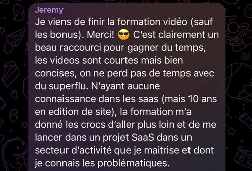 J'avais pour projet de lancer un SaaS, la formation m'a bien aidé pour les différentes étapes, je recommande ça donne les bonnes bases et ça permets d’avancer, de structurer et gagner du temps